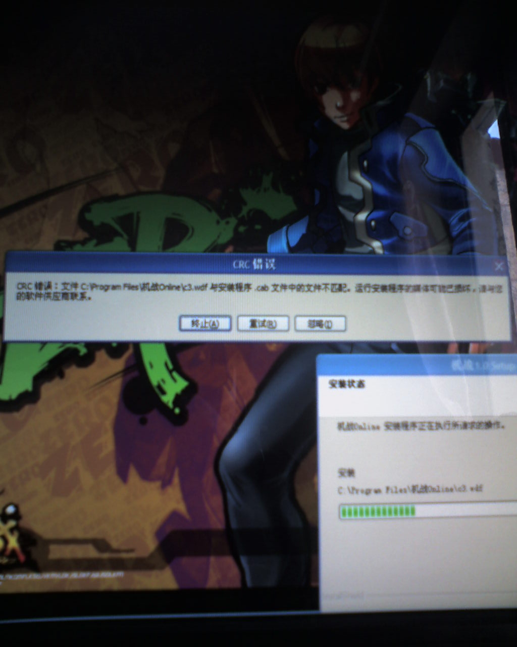 求助各位老鸟:小弟这次分区格盘装好系统安装机战客户端时出现提示"CRC错误:文件C:\PROGRAM  FLIES\机战ONINE\C3.WDF与安装程序.CAB文件中的文件不匹配。运行安装程序的媒体可能已损坏。请与您的软件供应商联系。"之后又从官网重下几遍,每次安装都是CRC错误?机战如此,天龙八部和天堂2也是如此。提示CRC失败与某某文件(这三个游戏的客户端都是EXE文本格式)就连从网上下的魔兽争霸3也一样?CRC解压错误(魔兽3是RAR文本格式)我从网上搜过有硬盘crc错误,WINRARCRC错误等等。同样是网络游戏,卡丁车就行,安装顺利也能玩!这次装系统也和以前不一样,必须装两遍才行(第一遍不是声卡没装就是USB没装)。系统是猪猪猫08春节奥运版。请各位老鸟帮帮小弟!不胜感激!