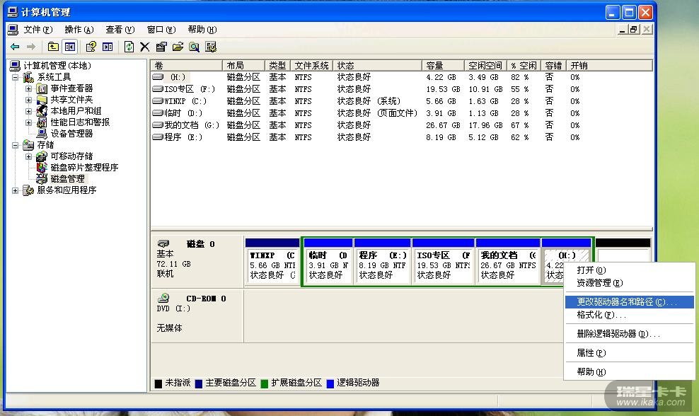 右键点“我的电脑”-》“管理”-》“磁盘管理”