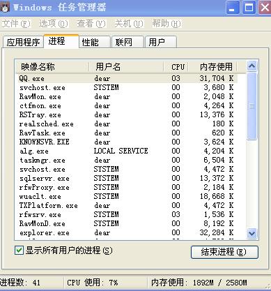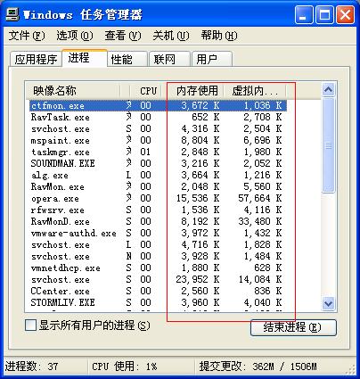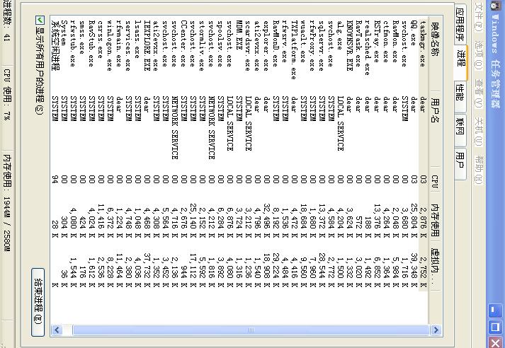 我的本本是DELL的,内存为512,后来就加了个内存条,现在任务管理器里面内存使用上限为2587M,一直用的也挺好的,可是最近两天不知道怎么了,总是动不动就在屏幕右下角说我的虚拟内存太低。我仔细察看任务管理器,发现以往内存使用只有几百M的,现在竟然达到近两千M。并且C盘的空间也快没有了。任务管理器里面也没有见什么可以程序啊。到底是什么占用那么多内存呢?杀毒又杀不出。任务管理器里面的程序CPU基本都是才10%以下,看来挺正常。拜托各位大哥,告诉我如何将我的电脑内存使用降下来吧,不要再提示虚拟内存太低的警告了。拜托了。