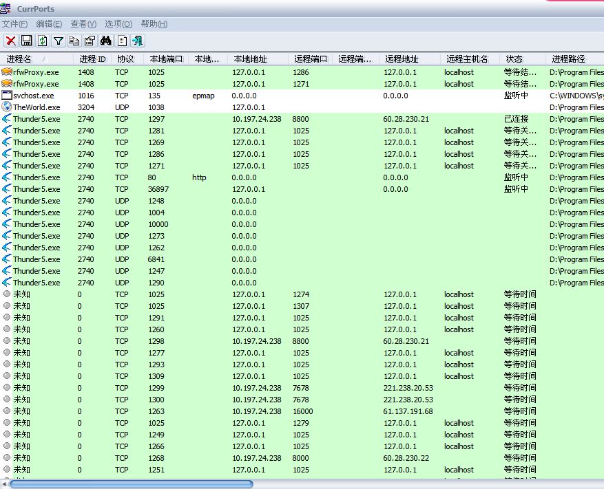 我昨天下载安装了“迅雷 (Thunder)V5.8.4.572 Ayu去广告安装版”,刚才打开一款CurrPorts的软件,然后启动迅雷,发现有很多的连接,并出现很多未知进程,但看不大明白,现附上截图,请高手们指教,这个软件能查出后门吗?表中的一些数据怎么看?