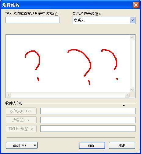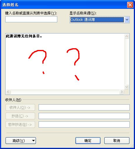 昨天,我的电脑重新检查恢复了office outlook 2003,然后使用手机和它同步了联系人,完成后。在发送新邮件时,不能在发件人里看到任何联系人,这是怎么回事?如下图: