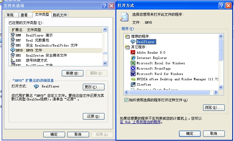 还有个麻烦点的办法,安装一个新的播放器软件,如暴风影音,安装后,会有提示是否关联的,关联后,再重新使用RealPlayer打开影音文件,系统会有提示是否关联,届时关联应该就没事了。