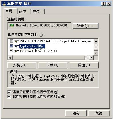安装并设置AFP服务 首先要安装AppleTalk协议,方法是打开控制面板,打开网络连接,然后在“本地连接”右键选单中选择“属性”项,在打开的窗口中选择“安装”,接下来选择“协议”,单击“添加”,然后在打开的窗口中选择“AppleTalk ”,单击“确定”,然后按照提示安装。