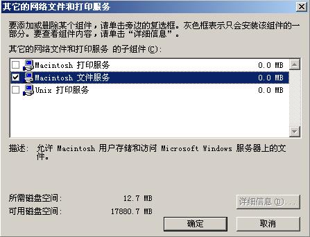 打开控制面板,打开“添加/删除程序”,然后选择“添加/删除Windows组件”,再选择打开窗口中的“其他的网络文件和打印服务”,然后在打开的窗口中选中“Macintosh文件服务”。然后单击“下一步”,按照提示插入Windows 2003的安装盘,安装程序会拷贝大概几MB左右文件到硬盘中。AFP服务就安装完成了。