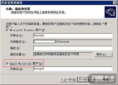 这里要特别注意一点,所有共享给MAC用户的文件夹必须是位于NTFS分区上,因为MAC是通过卷的方式与Windows 2003共享文件的,FAT文件系统不具备此项功能。当然还有另外一种文件系统可以访问,渔船文件系统(CDFS),但是这种卷对于MAC用户来说是只读的,并且也很少使用。