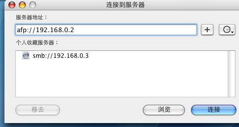 服务器地址内输入: afp://+windows 2003服务器的IP地址,点连接后输入windows 2003的用户名密码即可访问上面共享的文件夹。