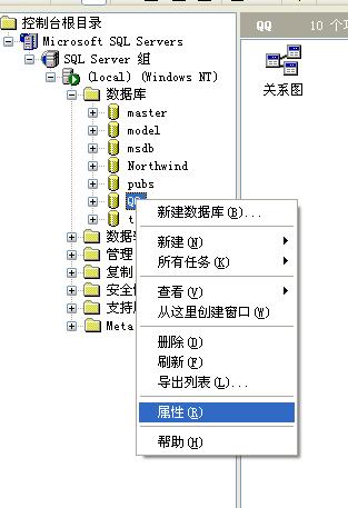 2.找到你所要备份的数据库,例如我要备份的数据库名字叫QQ。右键单击他选属性。