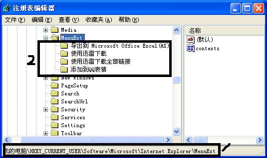 进入注册表编辑器,找到下图1处的注册表项并单击,看其下级子项中是否有“快车”或“flashget”的项目,如果没有,那就说明快车的右键扩展菜单没有被成功安装: