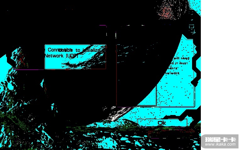参照上面提到的方法,运行星际程序,准备联网,点击“local area network(IPX)”,仍旧提示“unable to initializa network provider”。而且花屏。