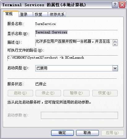 按照网络上的相关安全知识文章.我把服务中该停的都停了.唯独Terminal Services这一项有点问题.大多数时候打开对话框后,用了鼠标右键点击,点击属性,跳出的对话框中默认状态是启动,下面的停止、启动按钮都是灰化的,没法点。想停止也没法停止.可有一两次我去了某个网站,再打开服务对话框,发现这项已经被修改了.原来灰化的按钮可以点击了.我赶紧点击停止.禁用.可不久打开后发现又启动了,而且下面的按钮全都灰化了.不知道是怎么回事?现在没法停止.这个帖子我前面已经发过,不过可能没说清楚,一直没人回答。我现在怀疑是不是我的电脑被黑客入侵给控制了或中了木马了?哪位高手指点一下?