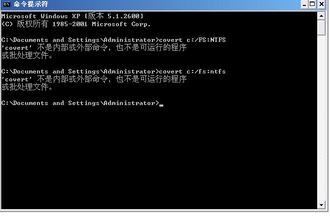 2. 打开窗口以后,在光标的提示符下输入“covert c:/FS:NTFS”,然后回车。注意在“covert”的后面有一个空格。