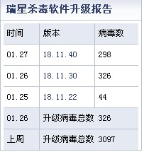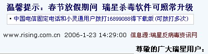 另据可靠消息:慑于瑞星春节期间正常升级的承诺,各类病毒作者都偷偷的回家过年去了。