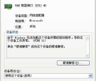 我在重启后,出现扫描磁盘画面,然后进入操作系统。......我最近未安装任何硬件,软件好象有 ENTERNET 300 和超级兔子之类。在论坛上下载安装了两个WINDOWS的补丁,现在也不知在哪儿.在网络适配器中,发现微型端口 IPX 2#有问题,由于 Windows 无法加载这个设备所需的驱动程序,导致这个设备工作异常 (代码 31) 。 请帮忙分析一下。