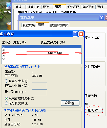 右键-》我得电脑-》属性-》高级-》性能的设置选项卡-》高级-》虚拟内存更改-》选个驱动器的卷标