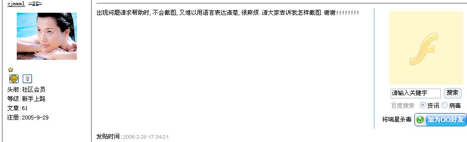 出现问题请求帮助时,不会截图,又难以用语言表达清楚,很麻烦.请大家告诉我怎样截图.谢谢!!!!!!!!