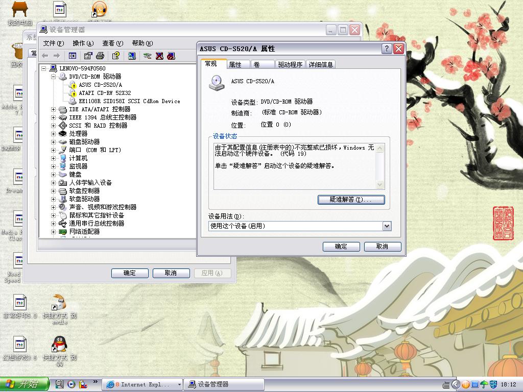 各位老师好:我用的是xp,最近卸了一个软件后,发现光驱符号没有了,进入设备管理器发现光驱前边是一个黄色的惊叹号,显示(由于其配置信息(注册表中的)不完整或已损坏,Windows 无法启动这个硬件设备。 (代码 19),我把光驱卸载后重新启动还是不行,哪位老师帮忙告诉我解决的办法,谢谢!!
