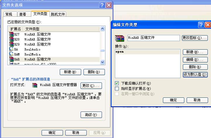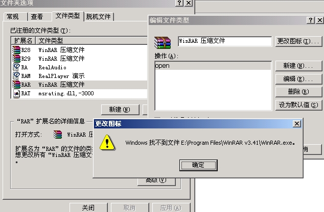 我卸载了WINRAR,后来再装上,发现在一些程序里的“打开”中,无法识别RAR格式的文件了(RAR格式的文件图标无法显示,显示未系统无法识别的图标),但在文件夹中可以识别出RAR的图标~~