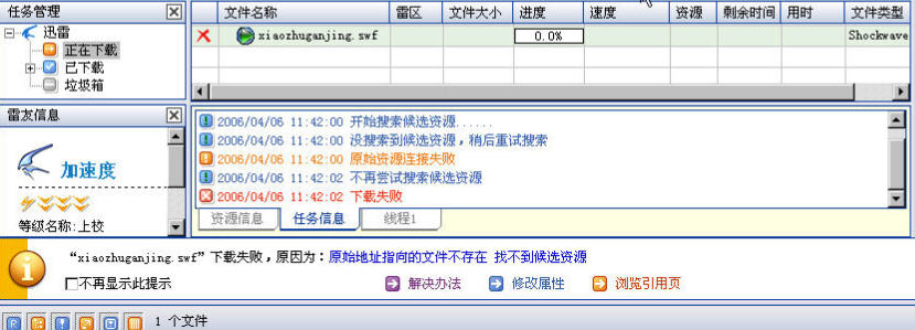 http://www.qbaobei.com/htm/story/jstory/223543204.htm。这个网页的资源为什么不能下载啊?比如要下载“小猪变干净了”,如图:迅雷却提示“原始地址指向的文件不存在;找不到候选资源”,不管是右击还是左击使用迅雷下载都不行。参看了迅雷下载框最下面的“解决方法”和“修改属性”仍不能解决下载问题!这么多的资源不能下载,怎么办?请高手指点啊!叩谢!!