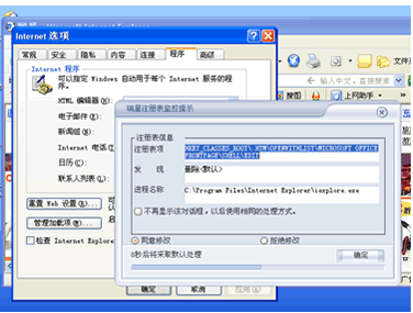 每当对Internet Explorer/工具/Internet选项/程序,进行设置的时候,点击"程序"就会弹出瑞星更改注册表的选项.说15秒后关闭.