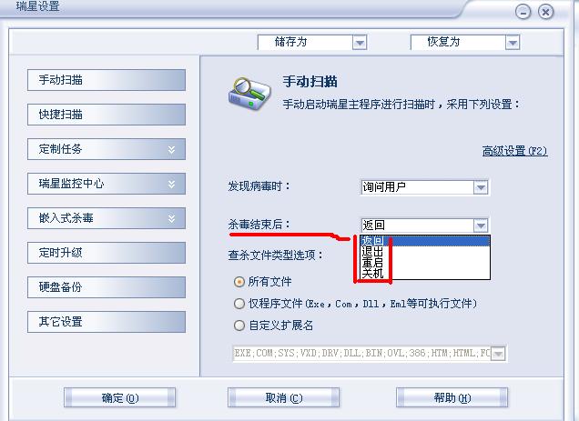 瑞星有没有“杀完后自动关机”这项功能?谁知道的告诉俺一下好吗?谢谢!