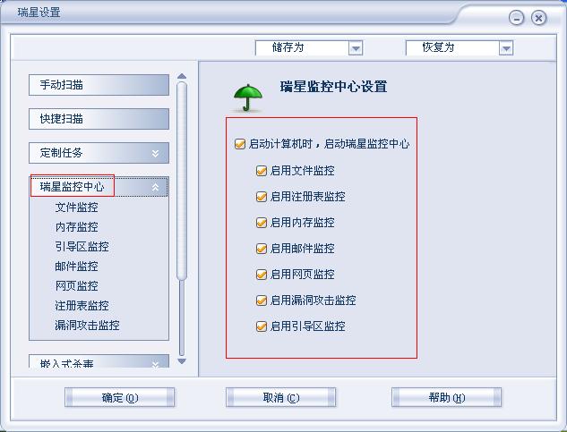我的瑞星监控每次开机它不自动运行,从哪把监控设置为永久开启状态!