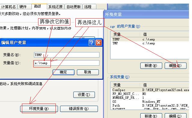 指到“我的电脑”→“击属性”→“高级”卡→再修改环境变量→如下图所示操作即可。