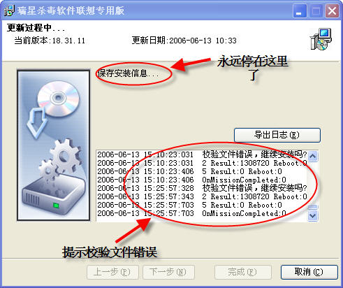 2006-06-13 19:52:58:843  校验文件错误,继续安装吗?