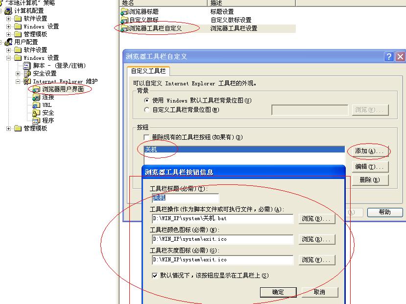 ③单击“开始→运行”输入“gpedit.msc”命令后回车,打开“组策略编辑器”,在左侧窗口中依次展开“用户配置→windows设置→internt Explorer维护→浏览器工具栏自定义”,并在弹出的窗口中单击“添加”按钮进入“浏览器工具栏按钮信息”对话框,在“工具栏标题处”输入按钮在IE工具栏上显示的文字“关机”,在“工具栏操作”处输入自动关机的批处理文件完整的路径,比如:c:\shutdown\关机.bat,注意:只能用输入路径方式,点击浏览器会找不到批处理文件。在“工具栏颜色图标”和“工具栏灰度图标”处分别输入按钮图标文件的完整路径,这两个图标可以相同,再点击两次“确定”后退出“组策略编辑器”