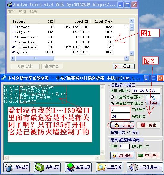 在昨天就给楼主回复了如下帖子“请用这“qqav2004木马克星\木马分析专家\freeport.exe”个程序来分析一下你有哪些端口有黑客在利用它,然后就可以根据实际情况将被利用的端口关闭即可,再就是用瑞星扫描系统有那些漏洞和被共享了的磁盘和目录,找到有被共享的磁盘和目录就将其关闭也可解决问题。”可他根本没有去照样做一下,我将本人系统里用这个freeport.exe程序所监控的图形发上来看看如下图所示
