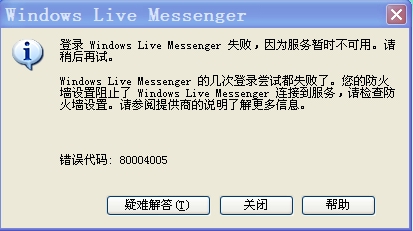 我的电脑操作系统是XP SP2,我下载安装了Windows Live Messenger 8.0。可是不知道为什么最近几天不能登录它,每次登录都显示出错信息80004005。这是为什么?我应该怎样处理?谢谢各位大侠帮忙。