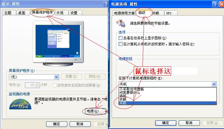 试试这样看能否帮你解决问题,鼠标指到桌面空白处→击右键→“属性”→“屏幕保护程序”→参见下面所示图例的操作: