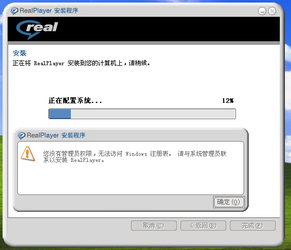我是新装的操作系统,SP2的,但在安装“RealPlayer10.5 简体中文版(官方原版+全功能plus补丁+双声道切换)”时出错,提示需要与系统管理员联系。无毒。那位高手能指点一下,谢谢!是不是在SP2下不支持呀。如图: