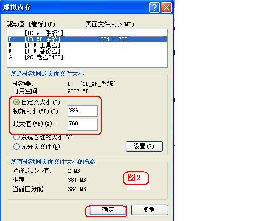 ③在该对话框中可看到关于虚拟内存的区域,点击“更改”按钮进入“虚拟内存”的设置窗口。选择一个有较大空闲容量的分区,勾选“自定义大小”前的复选框,将具体数值填入“初始大小”、“最大值”栏中,而后依次点击“设置→确定”按钮即可再见下一帖的(图2),最后重新启动计算机使虚拟内存设置生效。