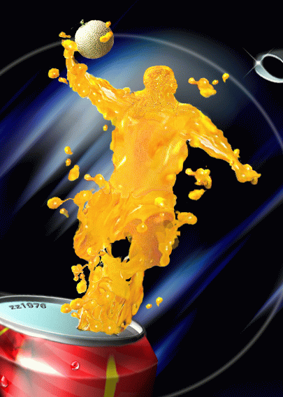 最后是头了,我做的时候本来想用果汁珠合成头部,结果发现象一个满头突起的怪物,十分难看,所以采用了另一种方法做头部:即在做好的果汁纹理上执行“Class(玻璃)滤镜”,质地选“载入质地”,选中飞人的素材,调节好参数,这样在做好的果汁上就会出现一个飞人的纹理,调入飞人素材的选择范围,将这个纹理剪切出来,将纹理的头部放到做好的身体上;调节一下明暗,使受光方向和身体相同。