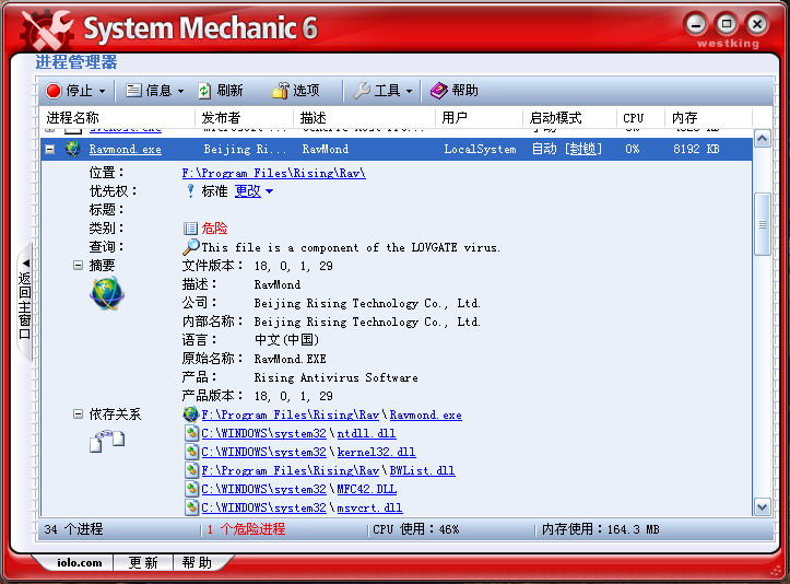 我装的System Mechanic 6 说Ravmond.exe这个进程是Lovgate Virus