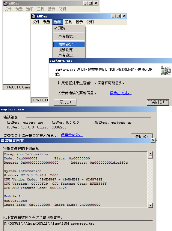 我的摄像 头安装了不能用,驱动安装没错,可是用不了,我拿到别的机子安装又能正常工作,从别人那里拿回来两个的摄像头在我的机子安装,一个能工作,别外一个和我的摄像头一样,打开摄像头时就出现如图