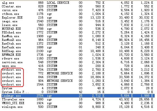 一般“svchost.exe”有四、五个进程是正常的它都是系统必须的参见下图俺的进程图片