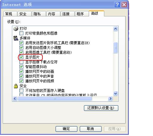 我刚看了我浏览器选项高级选项,里面的“显示图片”已经画上钩了!可是还显示不出图片啊?