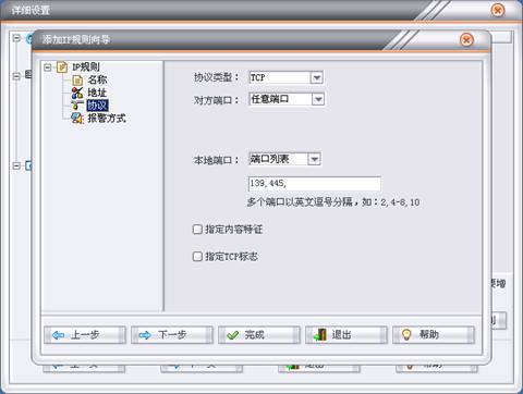 3、 规则名称填入“MS06-040”,执行动作为“禁止”,然后点击“下一步”。对方地址设置为“任意地址”,本地地址设置为“所有地址”,协议类型选择“TCP”,对方端口选择“任意端口”,本地端口选择“端口列表”并在其下面输入“139,445”,报警方式选择“托盘动画”和“日志记录”两项选中,点击保存。