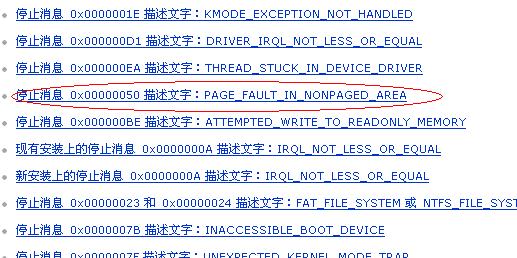 停止消息 0x00000050 描述文字:PAGE_FAULT_IN_NONPAGED_AREA