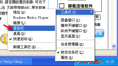 昨天我在下載電影的時候 中勒病毒 死機勒好機次 然后就把瑞星生到最新版本殺勒一遍 殺勒6個病毒 可是殺完后我髮現右下角的語言籃沒勒!我找勒好長時間 可是就是不知道上哪勒 本來還有的,今天早上我有去控直版麵裏找勒找 語言蘭設置找到勒 可右下角海是沒語言蘭 而且隻能用紫光輸入法 不能用智能ABC 原來就會打英語的 這樣還好點!所以隻能打繁體字。。。我迷茫勒 按 CTRL+SHIFT 也沒反映!真是運死勒!!!