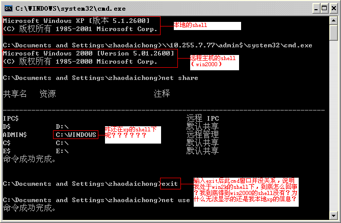 可是为什么获得了远程win2k的shell后,当前信息还都是本地的啊??!!