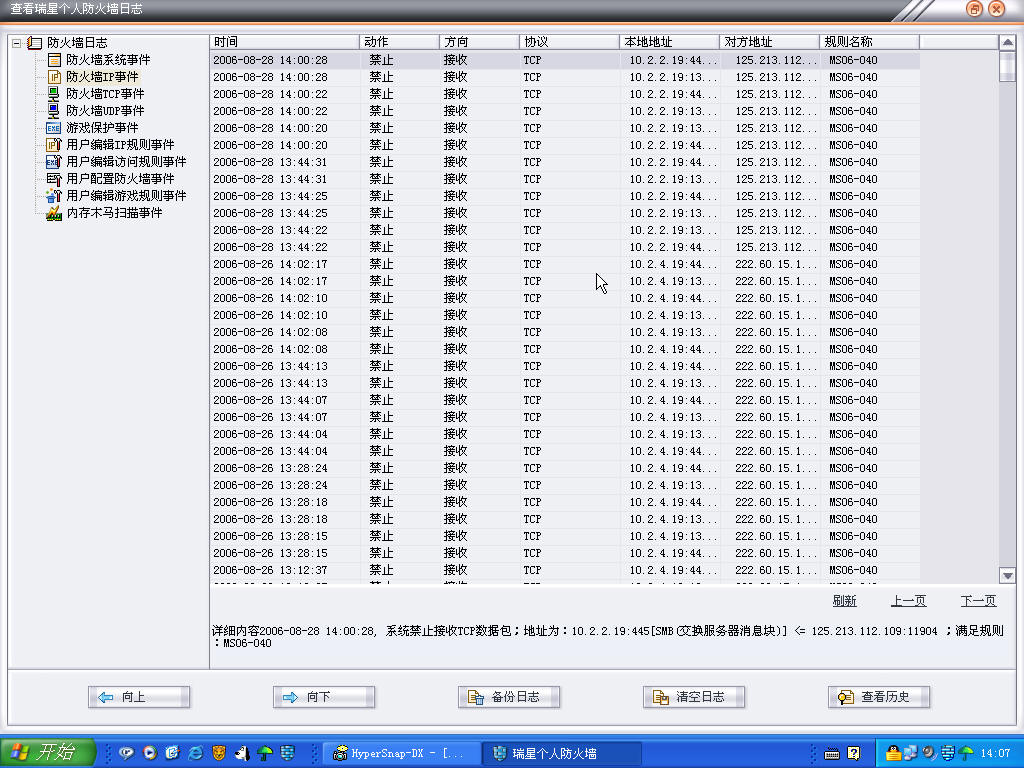 这几天,屏幕下角的瑞星防火墙老是莫名其妙的闪警灯,把鼠标放在上面就显示一个IP地址,从网上查到是我们本地的IP地址,但不是我的,从防火墙的日志里可以看到是防火墙IP事件,下面是我上传的截图,请高手帮我分析分析,谢谢!