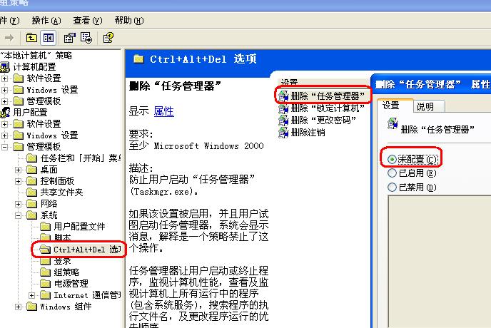 在“开始”→“运行”→输入“gpedit.msc”回车→进入“组策略编辑器”后,找到Ctrl+Alt+Del 项修改一下即可。