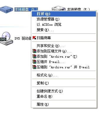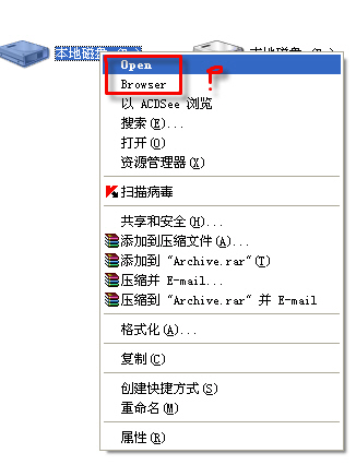 右击E或F分区,出现的菜单如图。不同的是它怎么多了两个英文命令“open”和“browser”,如果点这两个命令,都会出现顶楼“拒绝访问”的提示。但如果选择该菜单中的“打开”命令,则可以打开E或F分区。