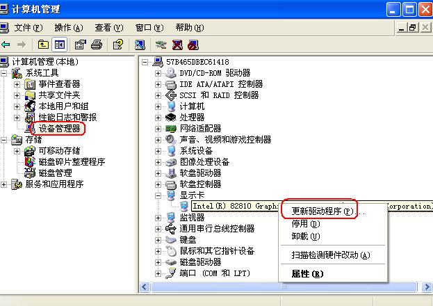 鼠标指到“我的电脑”击右键选择“管理”→“设备管理器”→再击右键菜单中参见下图红框中所示: