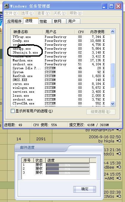 1、临睡觉前突然发现桌面有一对话框,不断显示接受和发送,且发现可疑进程