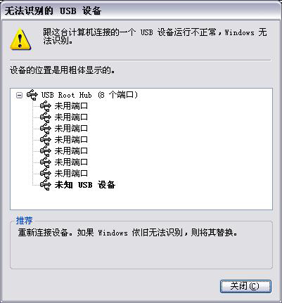 我接上移动硬盘时计算机出现这个提示,不能识别USB接口,这个问题怎么解决,请大家告诉我谢谢了。