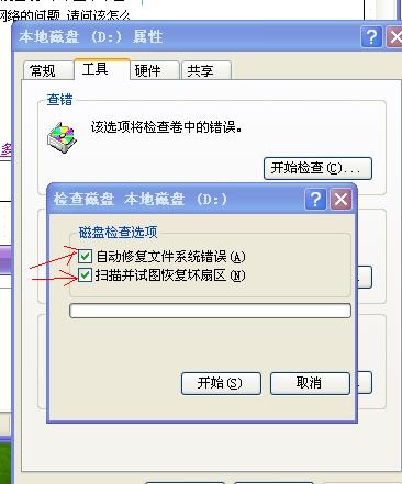 磁盘属性查错--工具--查错--勾选两项--确定--重启