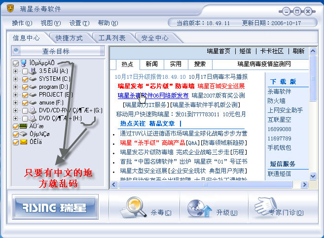 以前一直用正版江民满好的。昨天媳妇买了正版的瑞星,装了之后有个问题:打开瑞星后,主菜单中的“我的电脑”“光驱”这些中文都显示乱码,不知道瑞星软件如何解决这个问题那!